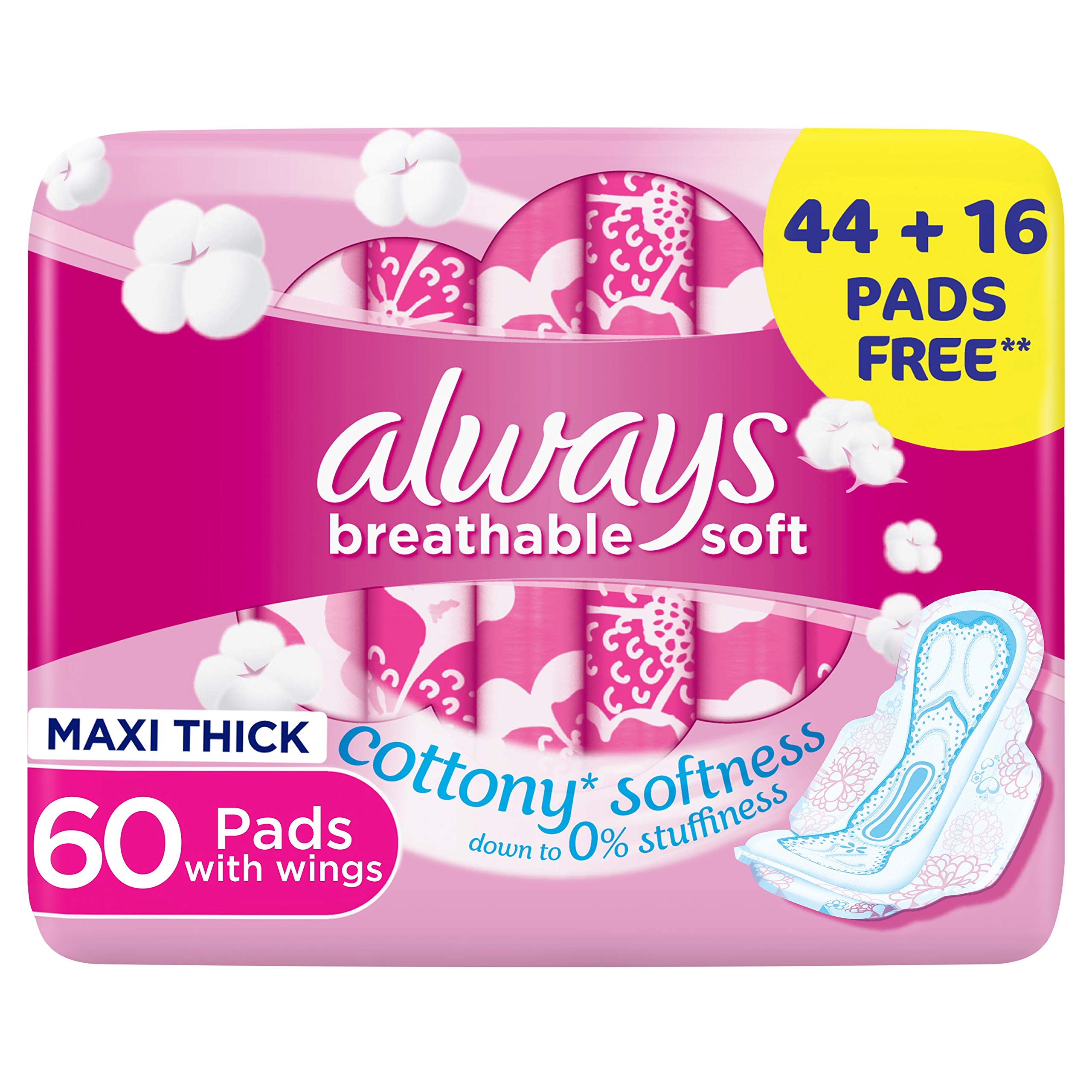 Always Breathable Soft pads Maxi Thick with wings offers you true breathable softness, down to 0% stuffiness. Try it yourself, 98% of women who tried it like it. This pad is the first to be both soft (on center and wings) and breathable so you can give your skin the care and love it deserves. Always Breathable Soft Maxi Thick is rated as being softer to your skin than any other cottony brands.