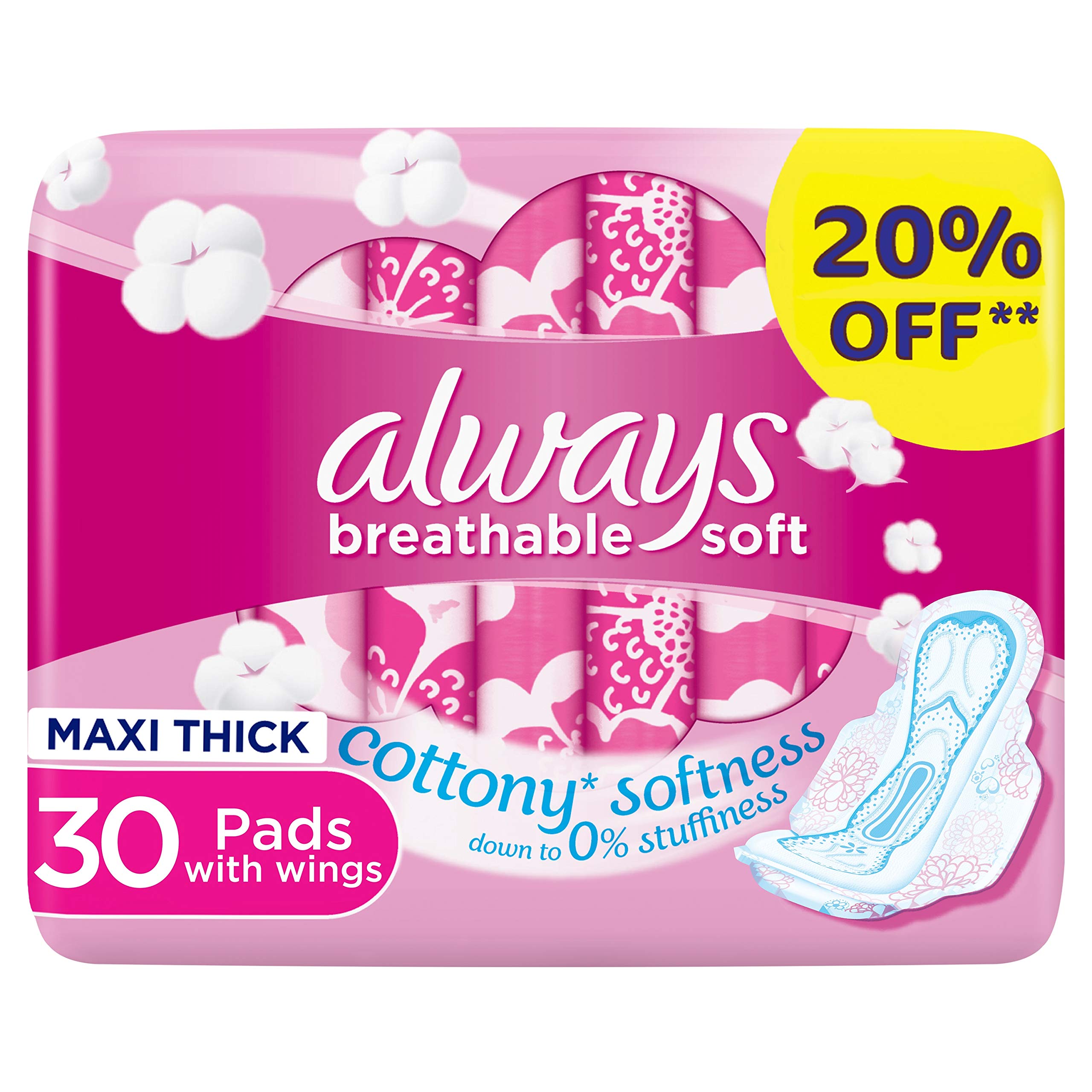 Always Breathable Soft pads Maxi Thick with wings offers you true breathable softness, down to 0% stuffiness. Try it yourself, 98% of women who tried it like it. This pad is the first to be both soft (on center and wings) and breathable so you can give your skin the care and love it deserves. Always Breathable Soft Maxi Thick is rated as being softer to your skin than any other cottony brands.